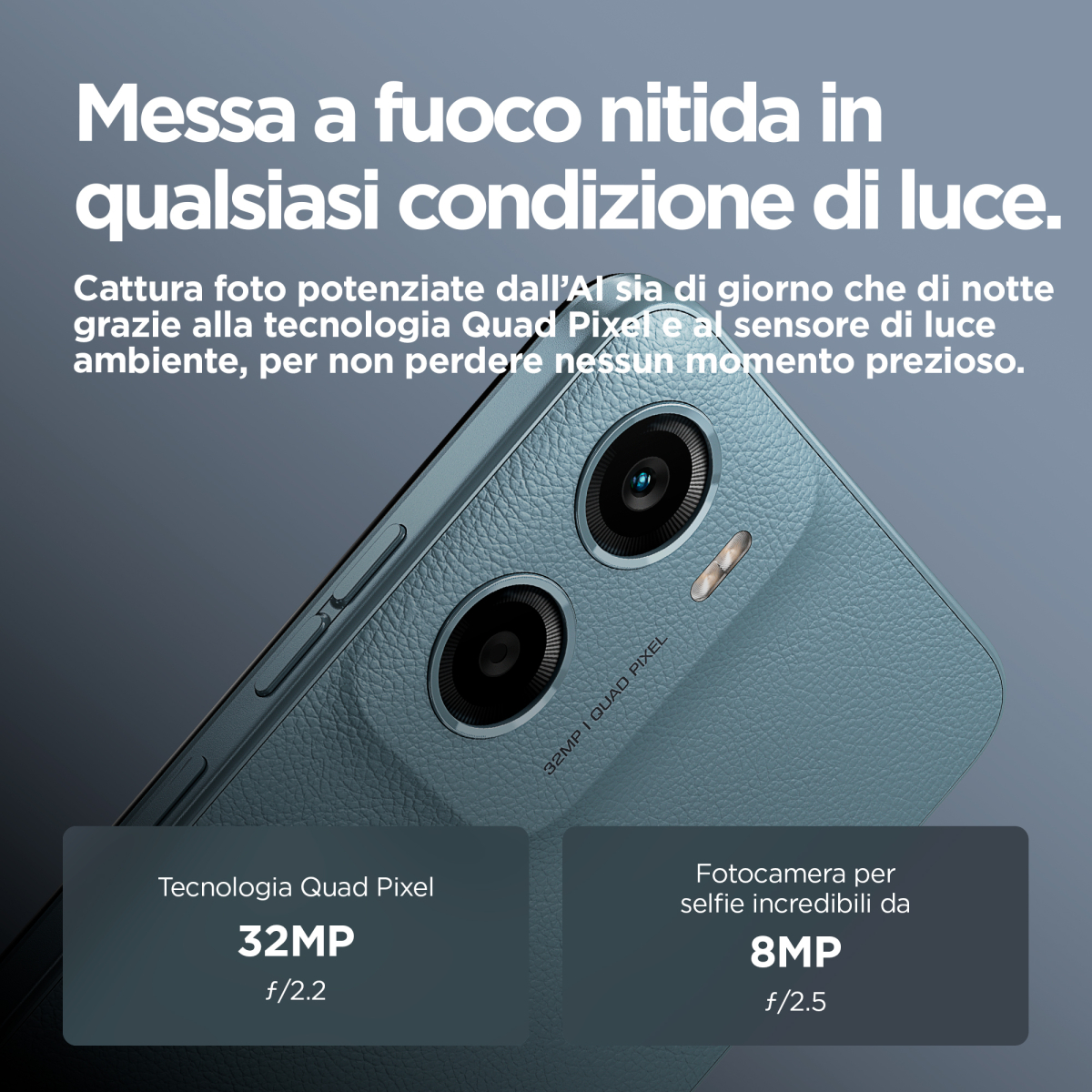 -Scatta foto incredibili con la fotocamera da 32 MP3 dotata di tecnologia AI e apprezza la fluidità offerta dalle prestazioni del processore MediaTek Helio G81 Extreme, il tutto in un design che abbina resistenza ed eleganza.