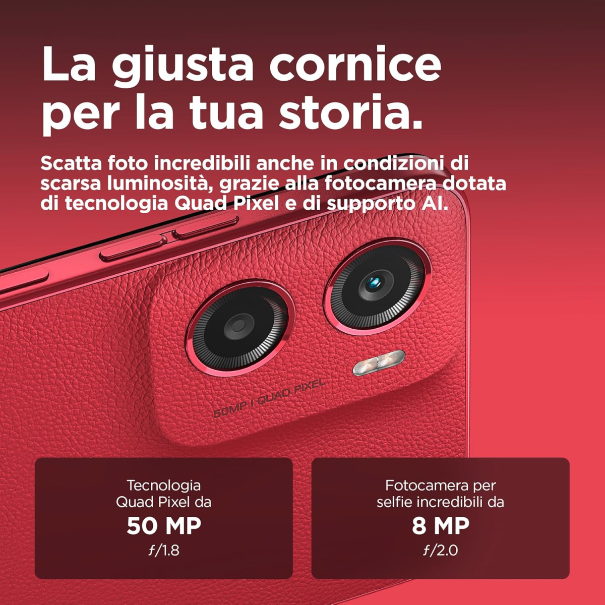 -Scatta foto vivaci in qualsiasi condizione di illuminazione con la fotocamera da 50 MP con tecnologia Quad Pixel per catturare dettagli bellissimi e la modalità ritratto con intelligenza artificiale crea ricordi di livello professionale.