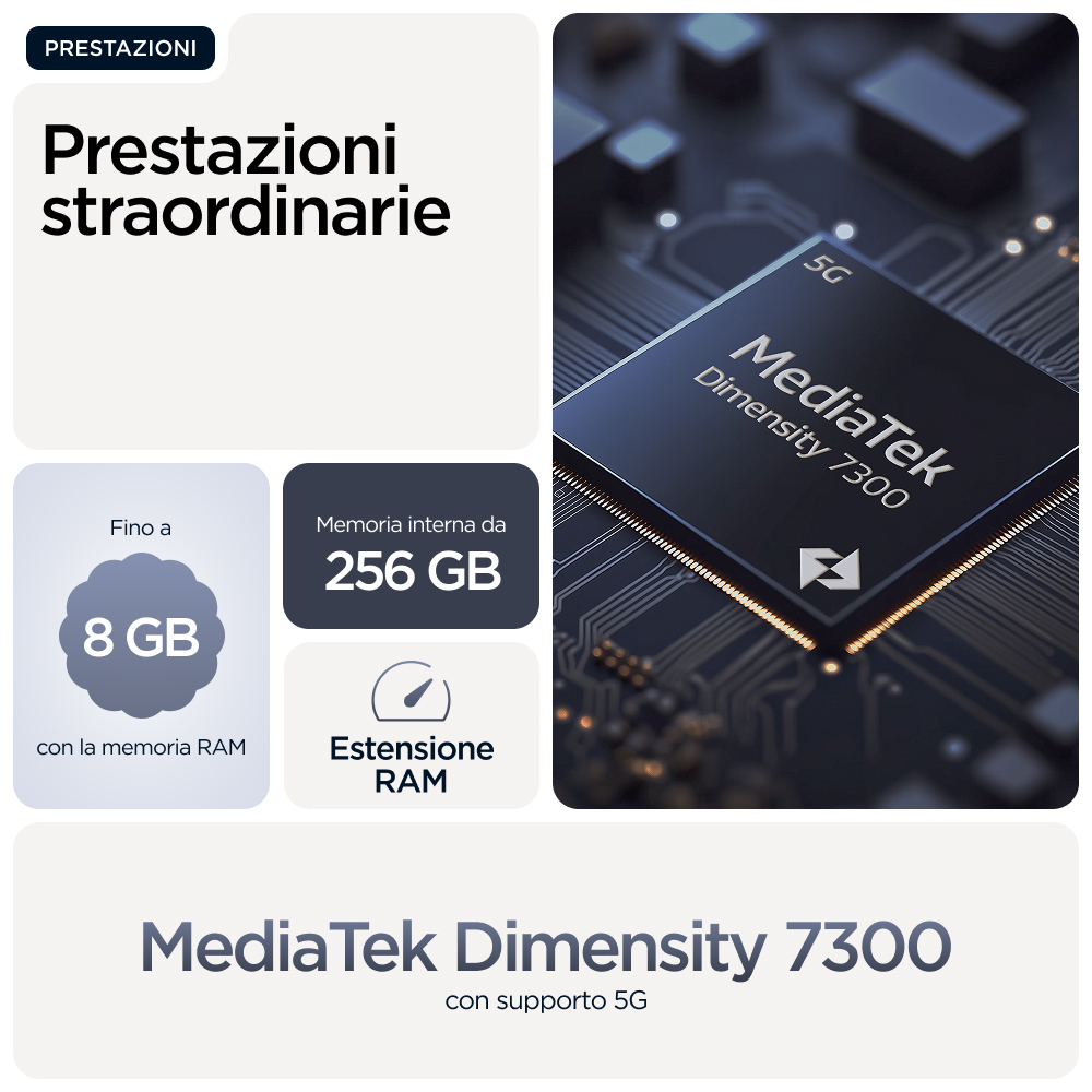 Dimensioni diagonale schermo: 16,9 cm (6.67"), Risoluzione del display: 2712 x 1220 Pixel. Famiglia processore: MediaTek Dimensity, Modello del processore: 7300. Capacità della RAM: 8 GB, Capacità memoria interna: 256 GB. Risoluzione fotocamera posteriore (numerico): 50 MP, Tipo di fotocamera posteriore: Doppia fotocamera. Capacità della scheda SIM: Doppia SIM. Sistema operativo incluso: Android 15. Capacità della batteria: 5200 mAh. Peso: 185 g